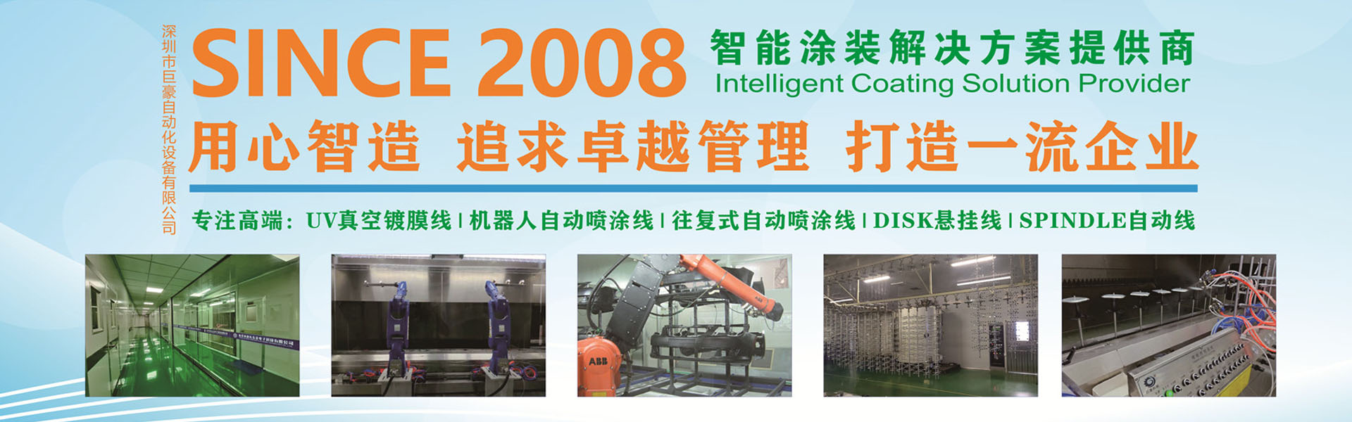 廣東省巨豪智能裝備有限有限公司是一家擁有自動(dòng)噴涂工業(yè)技術(shù)自主知識(shí)產(chǎn)權(quán)的高科技型技術(shù)企業(yè)。總公司位處廣東省深圳市寶安區(qū)松崗街道,工廠(chǎng)位于東莞市石排鎮(zhèn)占地面積8500平方米,擁有專(zhuān)業(yè)員工80余名,管理人員及技術(shù)人員近30名,是一家集工業(yè)噴涂機(jī)器人研發(fā)、生產(chǎn)、銷(xiāo)售,服務(wù)為一體的綜合性公司,擁有雄厚的技術(shù)力量、完整的質(zhì)量管理體系、精良的加工設(shè)備,專(zhuān)注噴涂技術(shù)領(lǐng)域12年。擁有多項(xiàng)國(guó)家技術(shù)專(zhuān)利,公司已經(jīng)為國(guó)內(nèi)外客戶(hù)提供了數(shù)百條各類(lèi)智能涂裝生產(chǎn)線(xiàn)。產(chǎn)品主要應(yīng)用于3C電子、五金塑膠、硅膠制品、汽車(chē)制造、家用電器、航空航天、陶瓷、玻璃等產(chǎn)品的噴漆,為企業(yè)量身打造涂裝自動(dòng)化及非標(biāo)設(shè)備解決方案,設(shè)備銷(xiāo)售區(qū)域遍布中